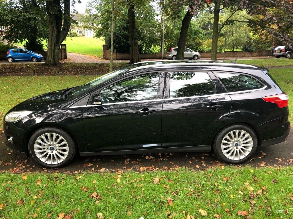 Metallic paint, Special solid - Frozen white, Metallic - Lunar Sky, Sony DAB Premium Sound System with Ford SYNC Bluetooth connection and voice control + Tyre repair kit, 'Ford Power' starter button, Active park assist, Bluetooth connection with voice control and USB port, Digital clock, Door ajar warning, Easy fuel capless refuelling system, Electric boot release, Exterior temperature gauge, Front and rear parking sensors, Lights on warning, Low screen washer fluid warning, PAS, Rear Park assist, Trip computer, ABS+Electronic Brake force Distribution, Deflation detection system, Driver airbag, ESP with traction control + emergency brake assist, Front inertia reel height adjustable seatbelts with pre-tensioners, Front passenger airbag, Front side airbags, Hill start assist, Side curtain airbags, Three rear inertia reel lap/diagonal seatbelts, Anti-burst high-security shielded door locks, Immobiliser-Passive Anti-Theft System (PATS), Locking wheel nuts, Remote central double locking, Thatcham Cat.1 alarm, 9 speakers, Steering column with mounted audio controls, 12V power point front/rear, 2 map reading lights, 4 spoke leather steering wheel with silver accents, 60/40 split back and cushion rear seats with 2 height adjustable headrests, Ambient lighting, Centre console storage box/armrest, Driver's seat electric height adjustment, Driver's seat with adjustable lumbar support, Driver/passenger front seatback pockets, Driver/passenger sunvisors with illuminated vanity mirrors + covers, Dual electronic automatic temperature control air conditioning - CFC-free, Electric heated front seats, Folding rear centre armrest with 2 cupholders, Footwell lights, Front/rear floor mats, Height adjustable front headrests, Illuminated heater controls, Isofix child seat preparation, Leather gear knob, Passenger seat height/lumbar adjustment, Pollen/active carbon filters, Reach + rake adjustable steering column, Rear armrest with storage, Rear overhead dome courtesy light, Sports style front seats, 'Quickclear' heated windscreen/heated washer jets, Auto dimming rear view mirror, Automatic rain sensing wipers, Bi-Xenon headlights and headlight washers, Black headlamp bezels, Body coloured bodyside mouldings, Body coloured bumpers, Body coloured door handles, Body coloured electric folding/heated door mirrors, Body coloured rear spoiler, Chrome finish on upper door line, Electric front and rear windows + one touch + global open/closing, Front fog lights, Front variable intermittent wipers with electric wash, Guide me home headlights with delay switch-off, Headlight levelling control, Heated rear window, High gloss black grille, LED daytime running lights, Tailgate wash/wipe, 17" 15 spoke alloy wheels, City pack - Focus